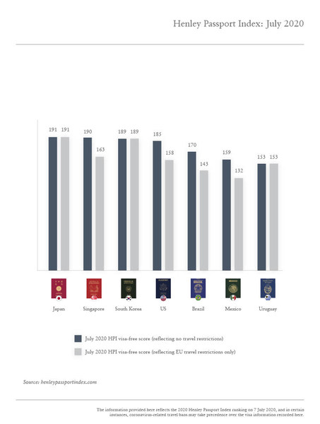 Without taking the current travel bans into account, Japan continues to hold the number one spot on the Henley Passport Index with a score of 191. Singapore remains in 2nd place, while Germany and South Korea are in joint-3rd place. Singapore however has been excluded from the EU list so its citizens currently have far less travel freedom than their closest competitors on the index, which is based on exclusive data from the International Air Transport Association (IATA).