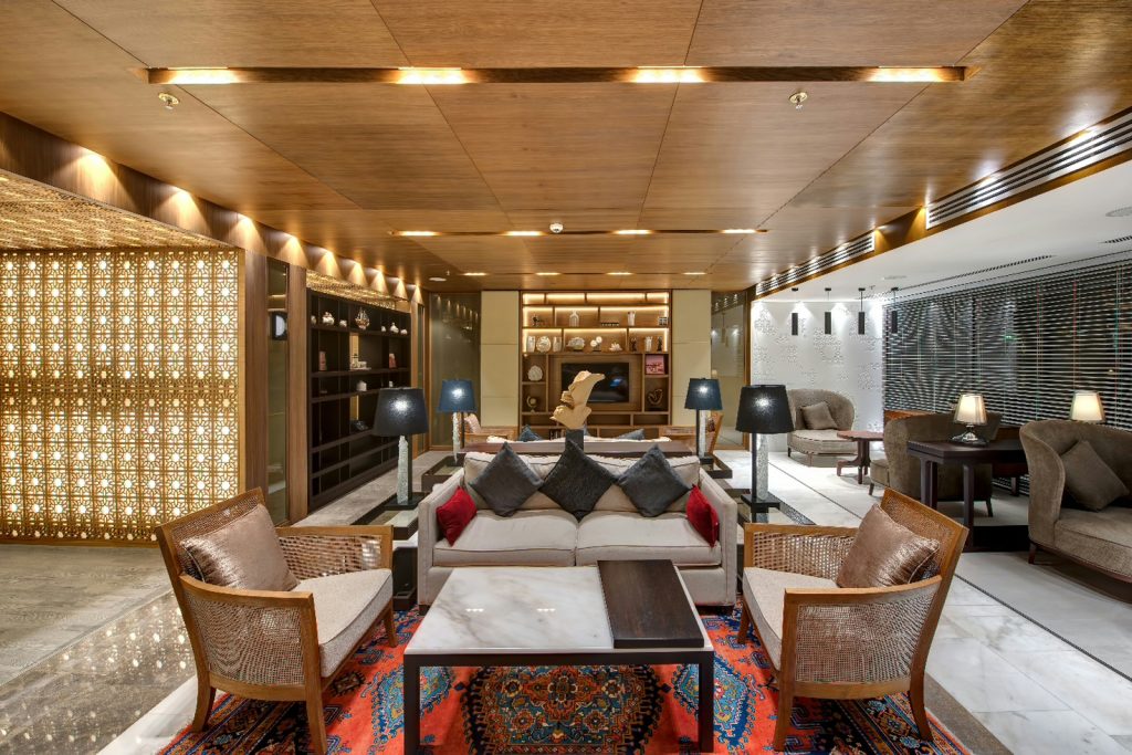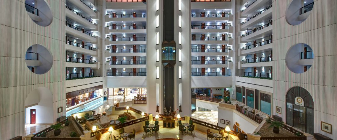 The area also overlooks the main atrium which offers a spectacular interior design which looks even more majestic from the glass elevator leading to the rooms and restaurant.