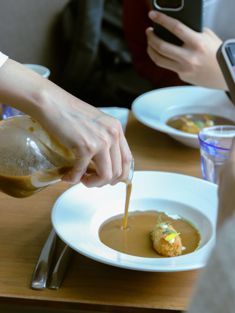 “A Culinary Celebration” experience begins with a Crustacean Bisque Soup, a velvety blend of lobster, prawn, crab, and fish broth, served with a freshly baked bread roll and butter.