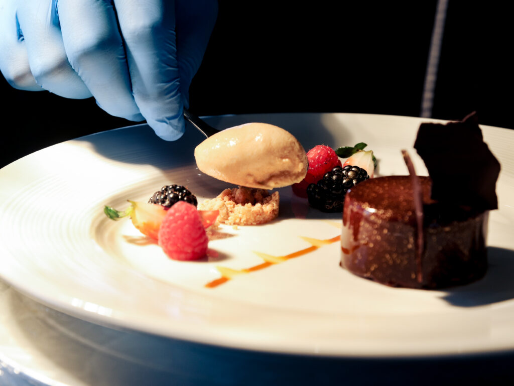 The meal concludes on a sweet note with the Ferrero Brûlée Entremets, accompanied by fresh berries, vanilla crumble, and salted caramel gelato — a delightful finale to this elevated dining experience.
