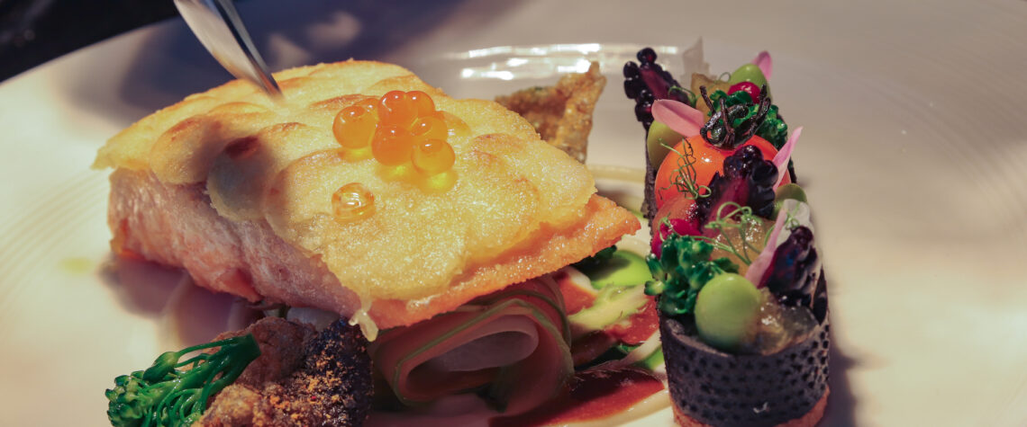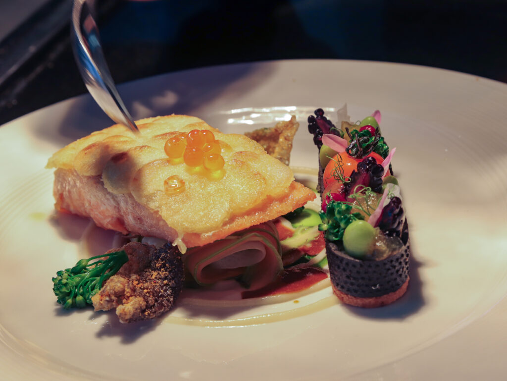 The Pan-Seared Salmon with Layered Saffron Potato features sustainably sourced salmon topped with to a golden layer of saffron potato. It is served with a homemade black Parmesan tart, naturally colored with squid ink and filled with lobster mousse, creating a striking and flavorful combination.
