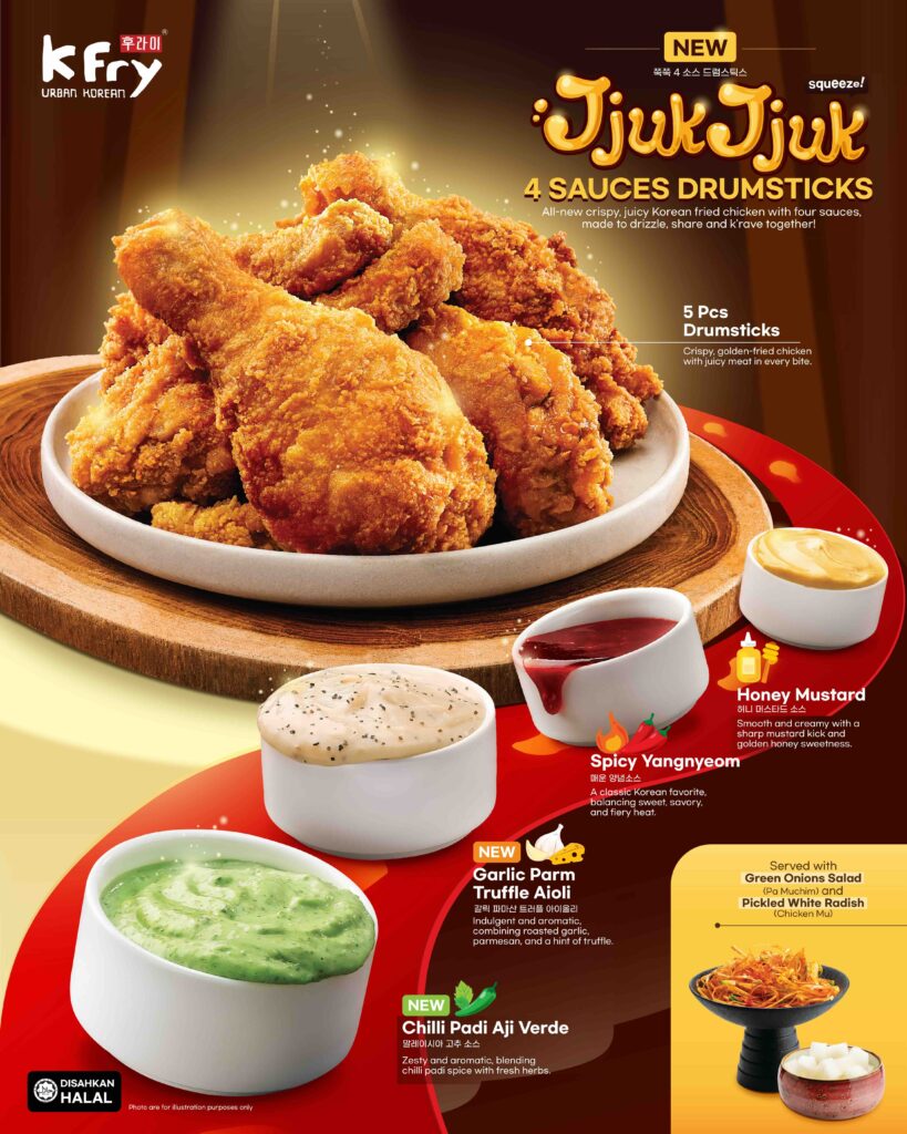 Ismail Bin Sulaiman, Pengarah Operasi K Fry Urban Korean berkata, “Rakyat Malaysia datang ke K Fry bukan sahaja untuk menikmati hidangan, tetapi untuk merasai kegembiraan berkongsi makanan bersama. Sepanjang tahun, kami melihat trend menjamu selera semakin berubah, pelanggan kini mahukan rasa yang mengejutkan serta penyajian yang menjadikan setiap meja terasa istimewa. Itulah sebabnya kami memperkenalkan Jjuk Jjuk 4 Sauces Drumsticks yang dihidangkan bersama Salad Daun Bawang (Pa Muchim) dan Lobak Putih Jeruk (Chicken Mu) serta gaya penyajian baharu. Ini adalah cara kami mengekalkan keterujaan buat peminat setia sambil mengalu-alukan pengunjung baharu untuk menikmati cita rasa Korea asli dalam suasana yang lebih premium dan menyentuh hati.”